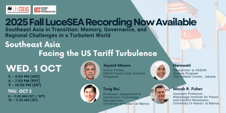The recording of our LuceSEA Webinar – “Southeast Asia Facing the U.S. Tariff Turbulence” is now available online.Part of the 2025 LuceSEA series Southeast Asia in Transition: Memory, Governance, and Regional Challenges in a Turbulent World, this session brought together regional experts Jayant Menon (ISEAS–Yusof…