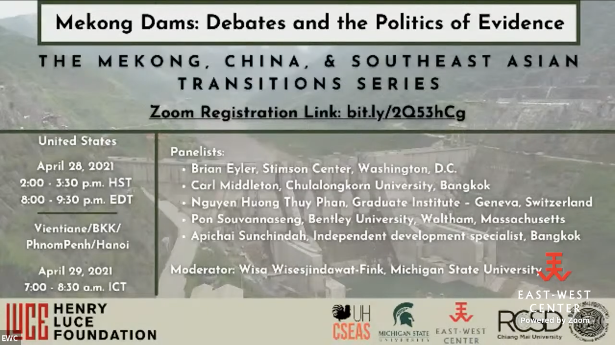 Panelists: Brian Eyler (Stimson Center); Carl Middleton (Chulalongkorn University); Nguyen Huong Thuy Phan (Graduate Institute Geneva); Pon Souvannaseng (Bentley University); Apichai Sunchindah (Independent development specialist)